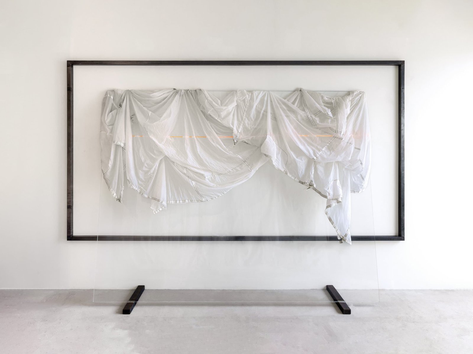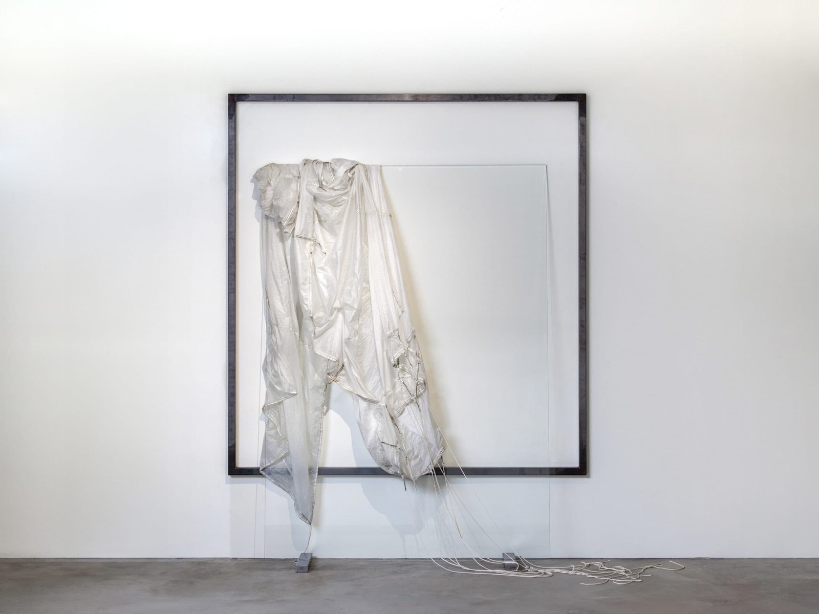 D’Annibale’s interest in and handling of materials is both technical and poetic. The Untethered series is part of a larger body of work marked by the use of vintage parachutes. The parachute’s paradoxical qualities strongly resonate with D’Annibale’s overall practice. Additionally, it commemorates a personal experience symbolic of letting go of control. The coexistence of the grid and intuition, tension and harmony, reason and poetry are prevalent in D’Annibale’s work. The silky, soft material covers the top edge of a sheet of glass, cascading down to the floor in complex yet elegant, effortless drapes. The metal frame hangs empty, binding the composition from behind. The mosaic of intricate folds and a variety of white hues give the parachute a sculptural body. D’Anniable continues to explore the notion of dimensionality by further deconstructing the medium of painting through different series, from the Restraints, to the Picturas and the Untethered. While there are compositional similarities, each series has a different sensibility. The Untethered pieces are less painterly, more minimal and somewhat ephemeral, as if the parachute had only just now deflated and landed on the glass.