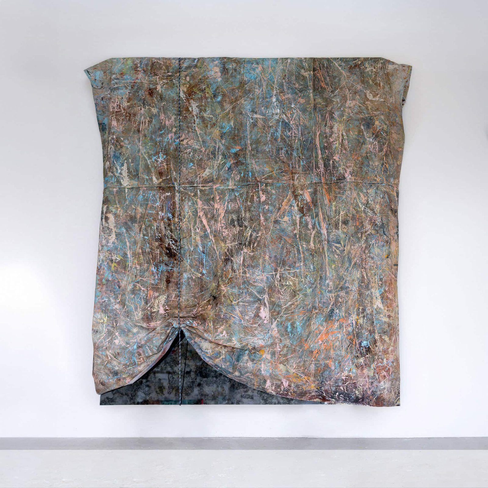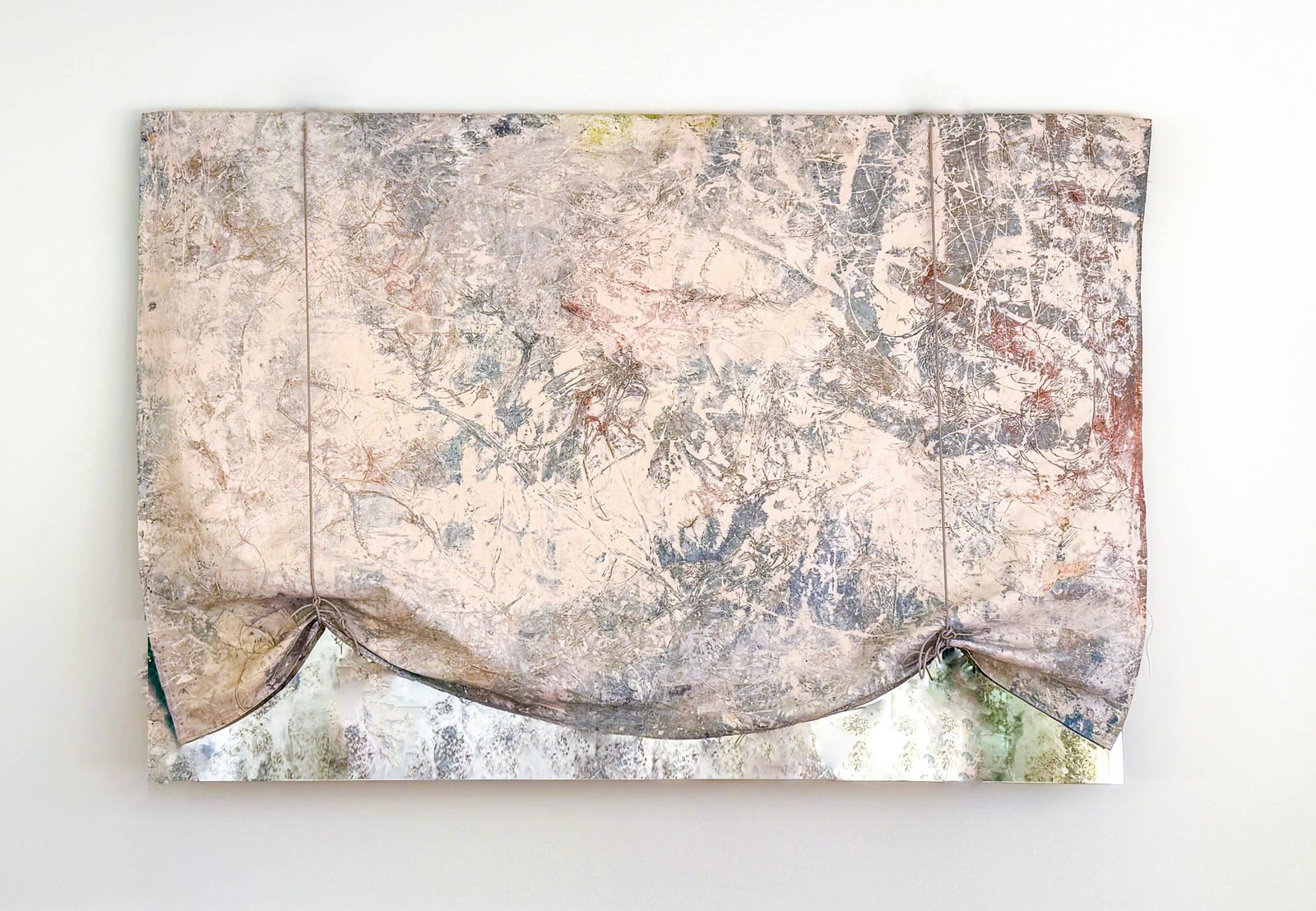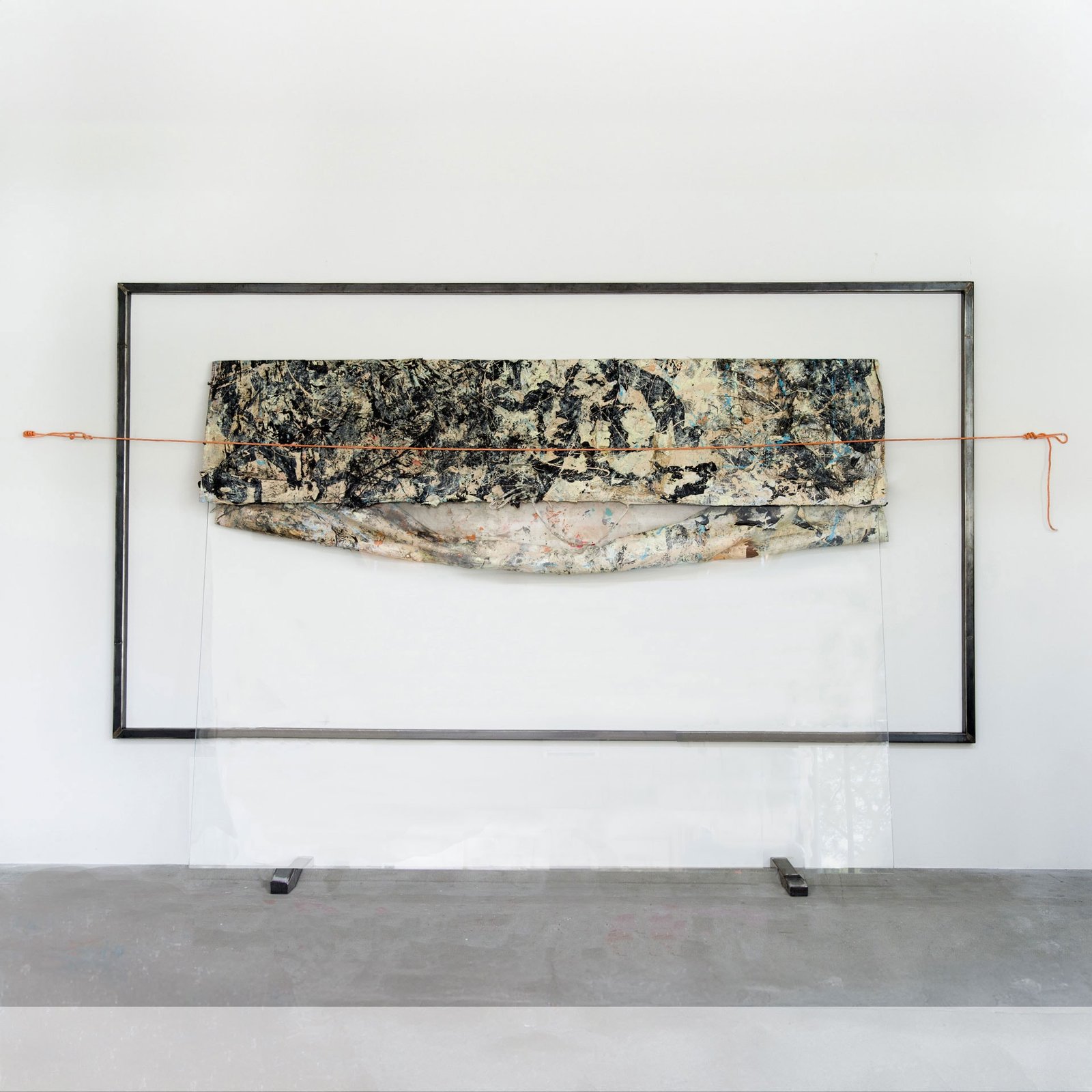 A characteristic of D’Annibale’s practice is the inclusion of a wide range of materials from across different disciplines. This is one way in which she investigates the boundaries and intersections of mediums. The Restraint series embodies a fusion of painterly gestures with the sculptor’s sensitivity. A painted canvas is hung over an oxidized mirror and tied vertically by a single rope which pulls it up, creating drapes and revealing the sleek, tinted background. D’Annibale juxtaposes contrasting materials to achieve unexpected depth. At the same time, her treatment of the canvas challenges the traditional composition of a painting. Consequently, the Restrtaints are effectively sculptures, starkly present and infused with tension and mystery. Layering, covering, and uncovering are key to D’Annibale’s process aimed at disrupting established patterns and connecting with the viewer.