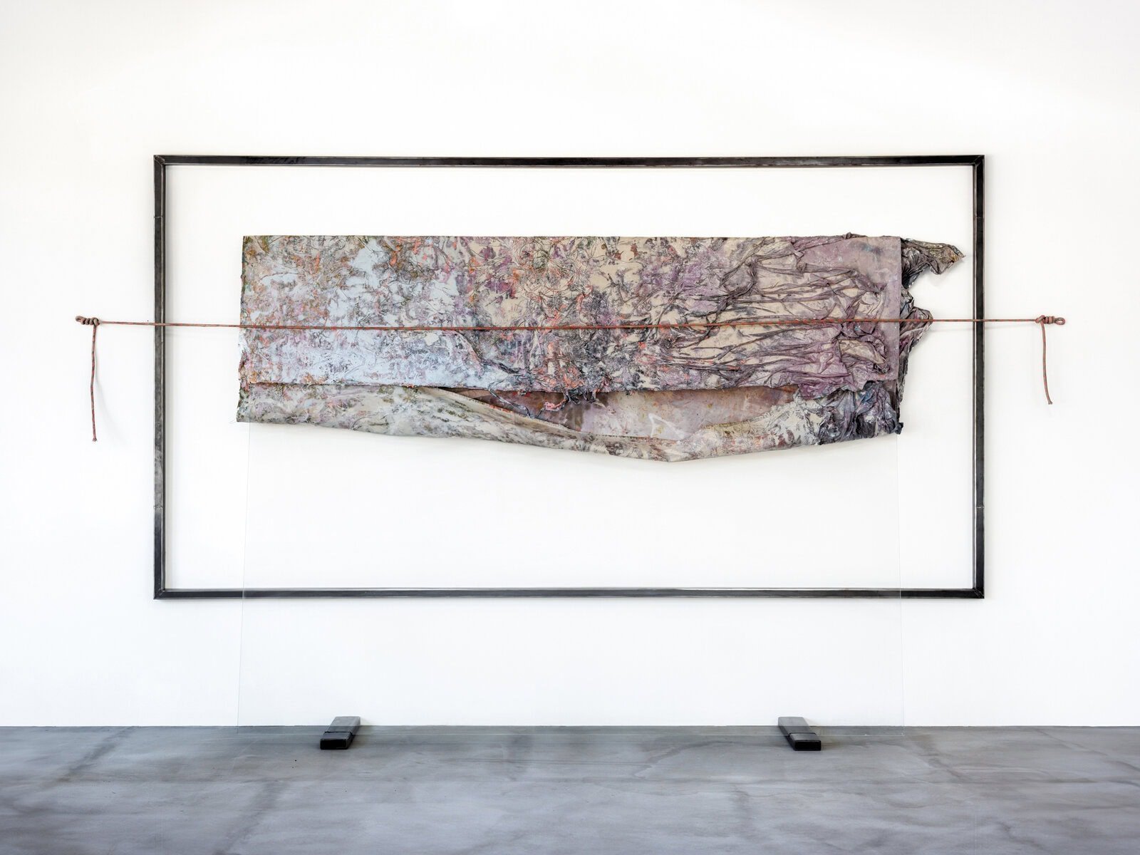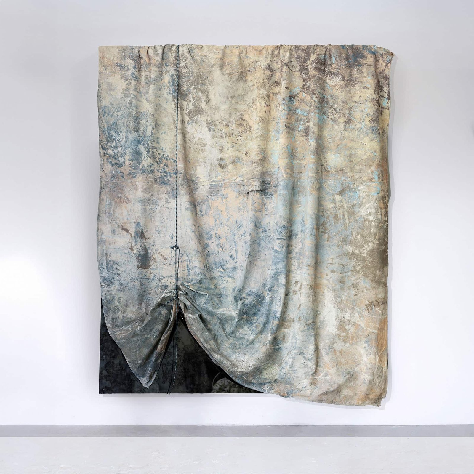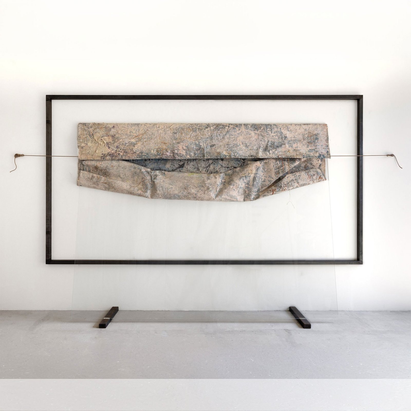 A characteristic of D’Annibale’s practice is the inclusion of a wide range of materials from across different disciplines. This is one way in which she investigates the boundaries and intersections of mediums. The Restraint series embodies a fusion of painterly gestures with the sculptor’s sensitivity. A painted canvas is hung over an oxidized mirror and tied vertically by a single rope which pulls it up, creating drapes and revealing the sleek, tinted background. D’Annibale juxtaposes contrasting materials to achieve unexpected depth. At the same time, her treatment of the canvas challenges the traditional composition of a painting. Consequently, the Restrtaints are effectively sculptures, starkly present and infused with tension and mystery. Layering, covering, and uncovering are key to D’Annibale’s process aimed at disrupting established patterns and connecting with the viewer.