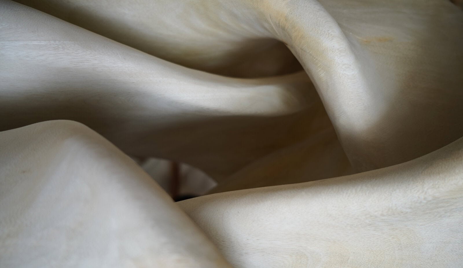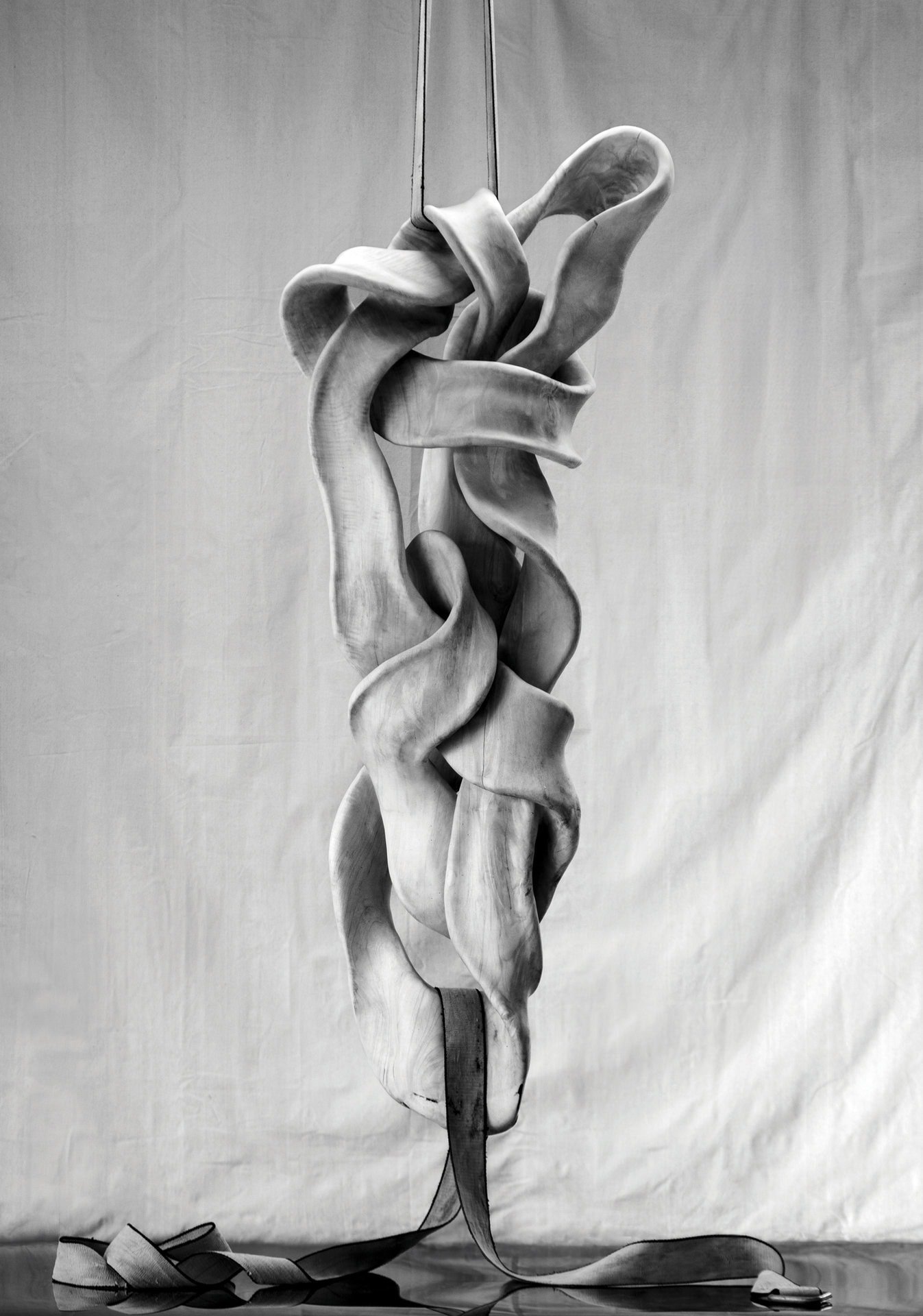 The Exquisite Corpse is a unique group of sculptures that speaks to Annibale’s profound relationship with nature and bridges various bodies of work; it incorporates pieces from the much earlier Hawaiian period and feeds into the composition of later Amalgams. The series is defined by complex, dense wooden forms carved from an entire tree. Their shapes follow the original natural tissue as part of D’Annibale’s intentional process. They look, therefore, intriguingly familiar yet, at the same time, distinctly novel. The sculptures hang suspended by a repurposed industrial strap from a metal frame or ceiling over a base of oxidized mirror and rebar. D’Annibale simultaneously draws inspiration from nature, treating it as a medium on its own, and confines it with industrial materials. Through contrast and intrigue, she points to the notion of environment as a sculptural capability of containing space.