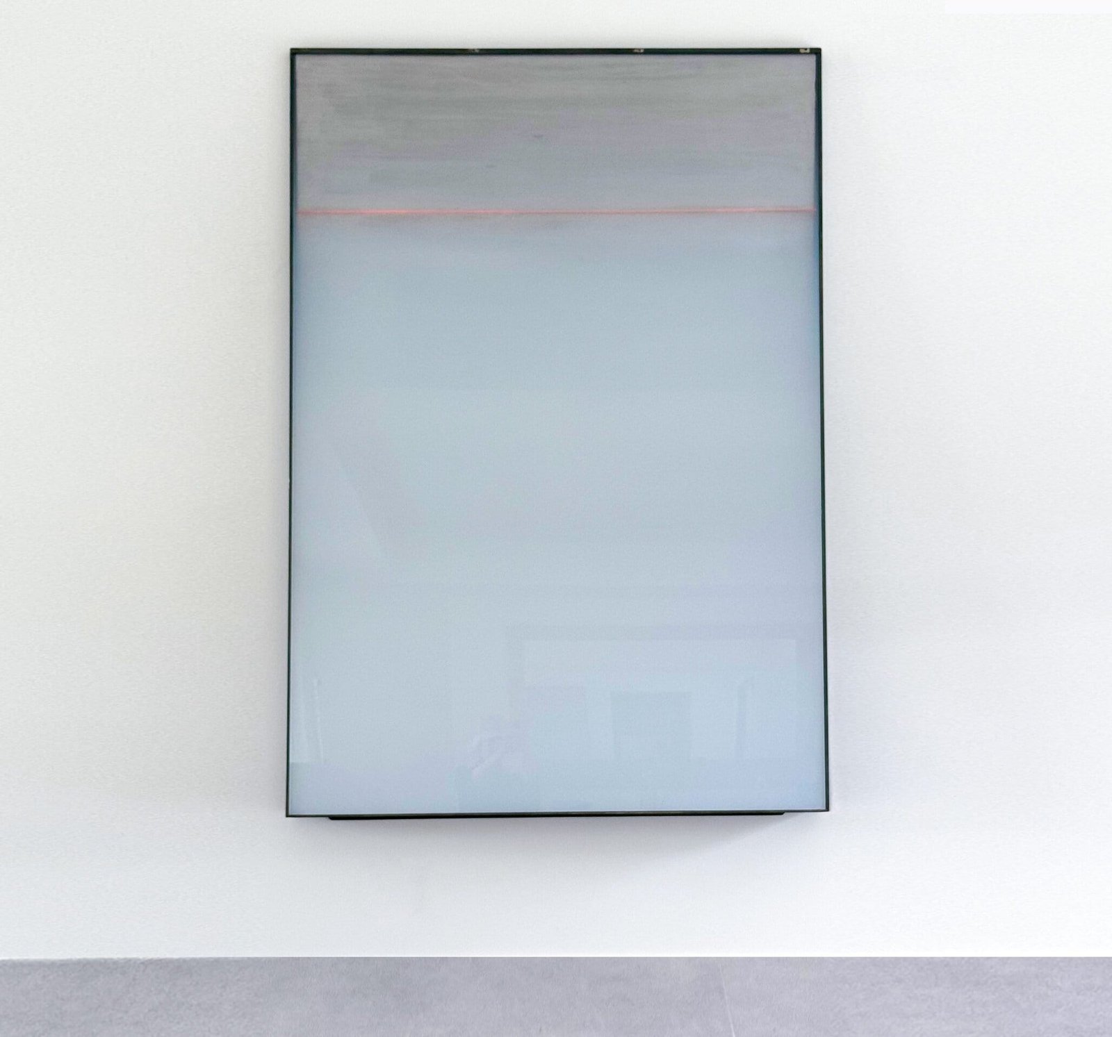 Though known for her large-scale immersive installations, D’Annibale achieves a similarly visceral impact with White Noise on a more intimate scale. As a wall sculpture from the Liminals series, White Noise draws from architectural interventions, yet rather than disrupting an existing structure, it captures and introduces an entirely new environment to the space it inhabits. The work features a rectangular steel form, seemingly sliced diagonally, affixed to the wall. A gleaming orange line and mirror-like polished steel back subtly emerge through the white gradient glass top. D’Annibale challenges the viewer to navigate this visual ambiguity, encouraging an active process of discovery and demanding a deeper engagement to unravel the ‘static’ and find clarity. The work evokes a sublime quality, capturing the horizon and fog within its sleek, industrial frame. This juxtaposition of the sublime with the industrial creates a powerful visual and emotional tension, quieting the noise of contemporary life. Through its layered, blurred, reflective surfaces, the piece embodies a liminal space—caught between the tangible and intangible, between dawn and dusk—offering a moment of stillness in an otherwise chaotic world of information overload.